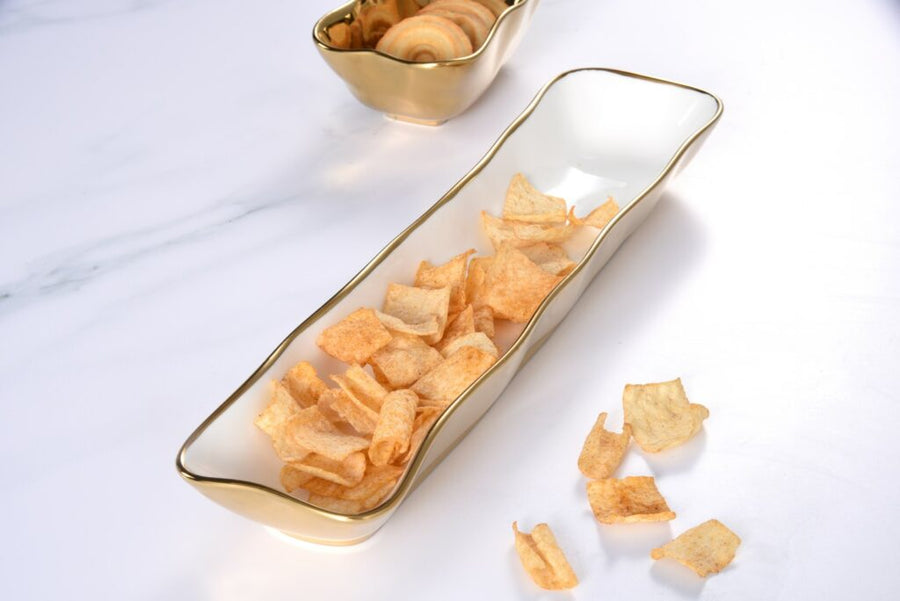 Bring a touch of elegance to your next gathering with the Moonlight White and Gold Cracker Tray. Expertly crafted from high-fired porcelain, this tray is the perfect way to showcase your favorite crackers, small cookies, and other delightful treats.