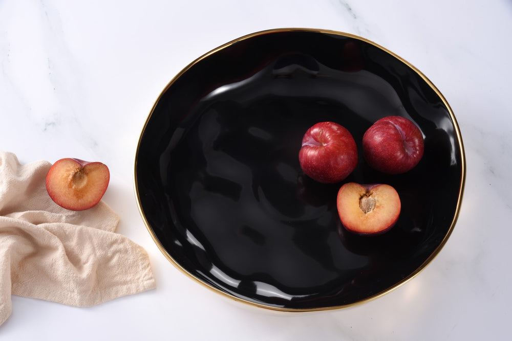 The Black and Gold Salad Bowl features a sleek black interior with elegant gold exterior. The striking combination of black and gold creates a visually stunning piece that exudes luxury and refinement. The deep black hue provides a sleek finish, allowing the radiant gold details to shimmer and catch the eye.