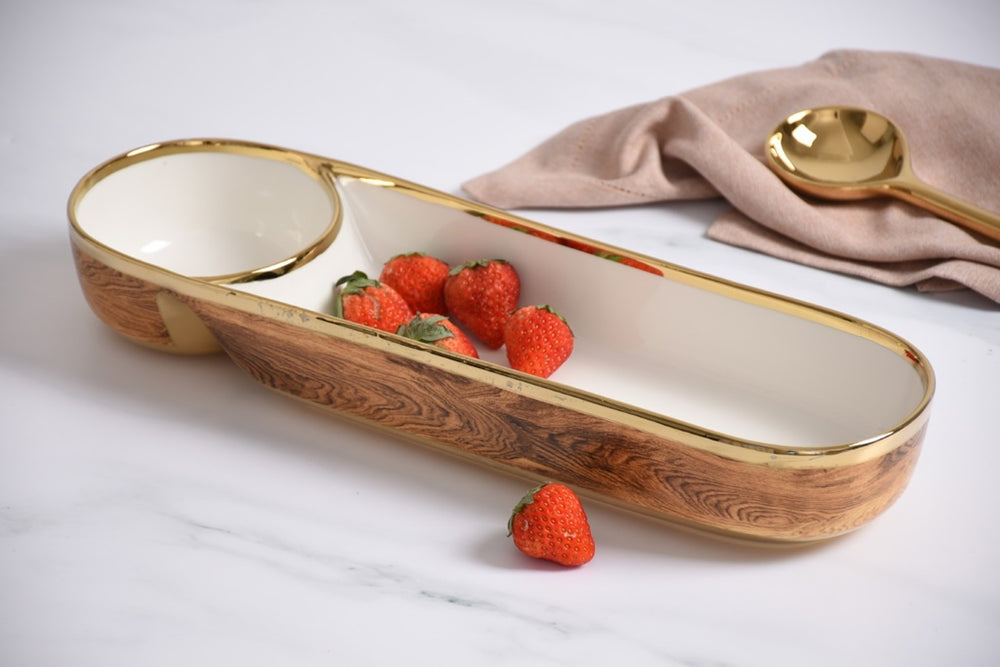 Elevate your entertaining experience with the Chip and Dip Server. Embrace the natural beauty of wood and the allure of gold accents, creating a focal point that will impress your guests and elevate the aesthetics of your table setting. With this server, you can effortlessly combine style and practicality, making it a must-have for your next gathering.