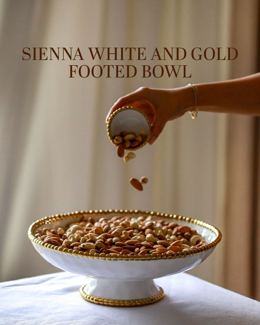 The beautiful gold beaded detailing adds an elegant touch that is sure to impress your guests. Perfect for everyday use or special occasions, the Sienna White and Gold Footed Bowl is a must-have for any home.